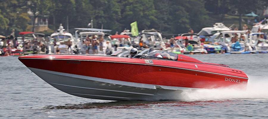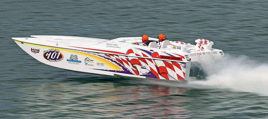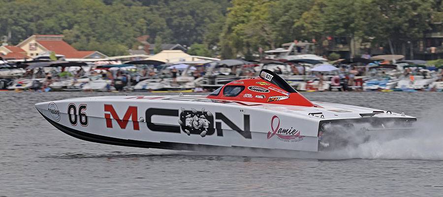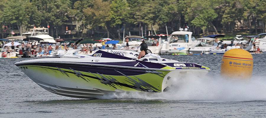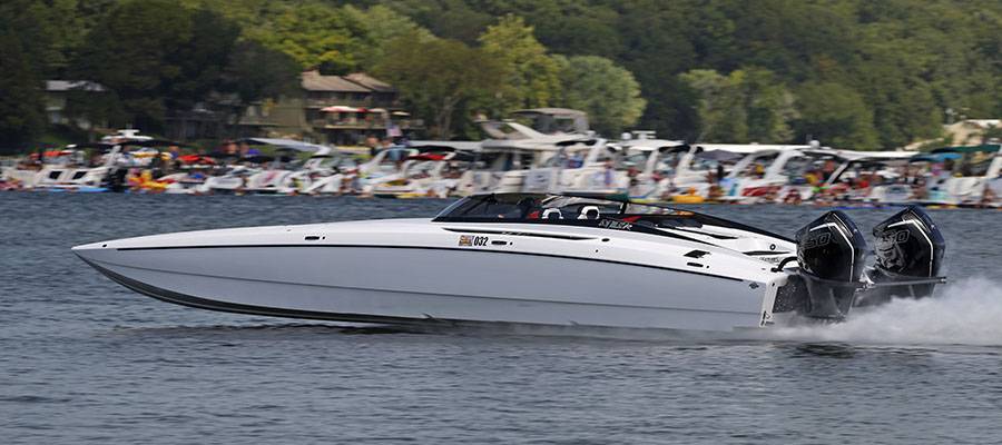 With his wife, Tracy, by his side, Lake of the Ozarks Shootout Hall of Fame member Tim Kowalski ran his Sunsation 34 CCX to 80 mph.