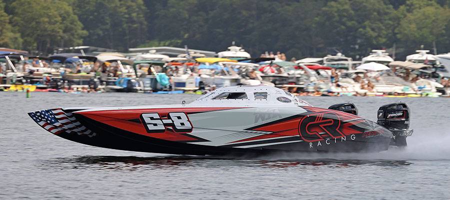 For the spectators onsite and the audience watching online and on TV looking to see record-breaking big speeds from the typical top guns at the Lake of the Shootout in Central Missouri on Saturday, there likely was a little disappointment as the only possible 200-plus-mph entry in the mix—American Ethanol, the 50-foot Mystic Powerboats catamaran owned by Don Onken and the six-time defending overall Top Gun winner—reached 184 mph during its third pass on the 33rd annual event’s three-quarter-mile course.