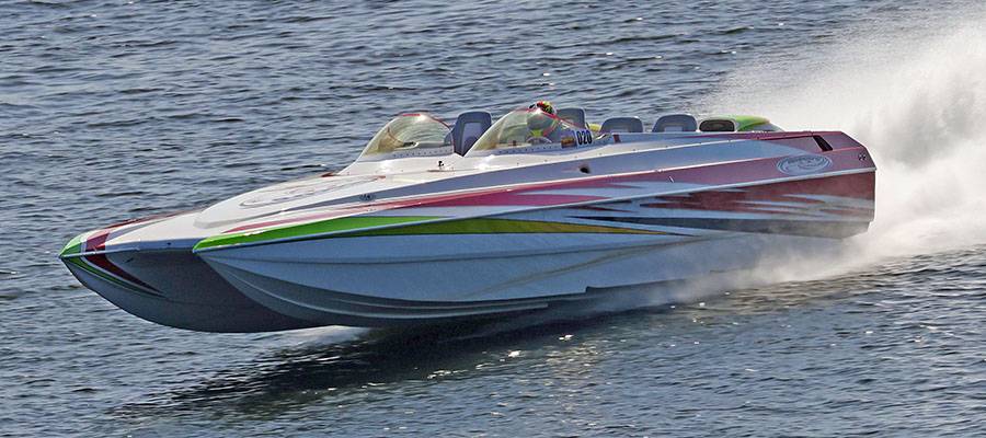 California performance boater Mark Cooper ran 134 mph in his DCB F32 catamaran in his first time at the Shootout.