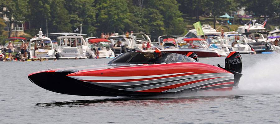 In a break in the racing action mid-day on Saturday, Performance Boat Center’s Super Stock-class teammates Myrick Coil and Rusty Williams took part in an exhibition race with the Brian Correll Air Shows acrobatic aerial stunt plane.