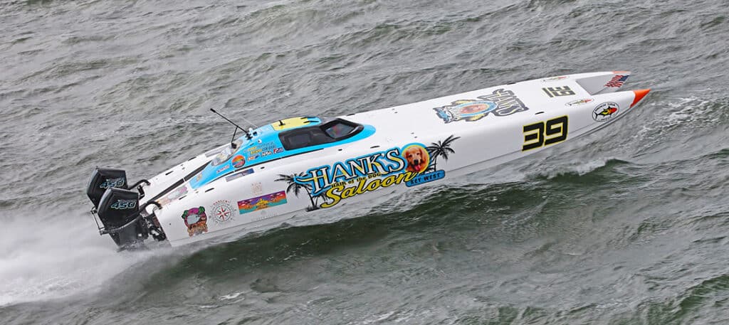 Scheer said he knew from the start that he had too much propeller once he saw the conditions. “It was a washing machine,” he said of the confused seas. The veteran throttleman decided on the third lap to put the boat in cruise control and let attrition play its role. It was a savvy move that kept the boat and engines in one piece and put Hank’s Saloon in second place when the checkers flew.