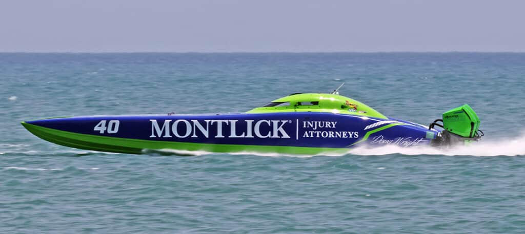 The Monster Energy/M CON team of owner/throttleman Tyler Miller and driver Myrick Coil took to the six-mile course in the Gulf of Mexico first, but they were running at a disadvantage from the start. They had gone out earlier in the day to test and tossed a blade off one of their propellers. Miller told the livestream broadcast crew that the team didn’t have a suitable replacement, which explained why he and Coil logged a time that was nearly 10 seconds slower than the pole position.