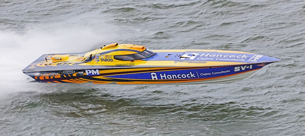 In the Super V race, throttleman Anthony Smith joined driver Elijah Kingery in the cockpit of the 40-foot Fountain, Team Farnsworth/Hancock Claims. For Smith, it was the first time he ran a Fountain with Arneson surface drives. Owner/throttleman Bill McComb and driver Ed Wendt ran their 39-foot Skater, Race Winning Brands, and throttleman Kirk Britto and driver Zachary Gerzeny were in the 40-foot Fountain, Cortez Cove/Fountain Racing.