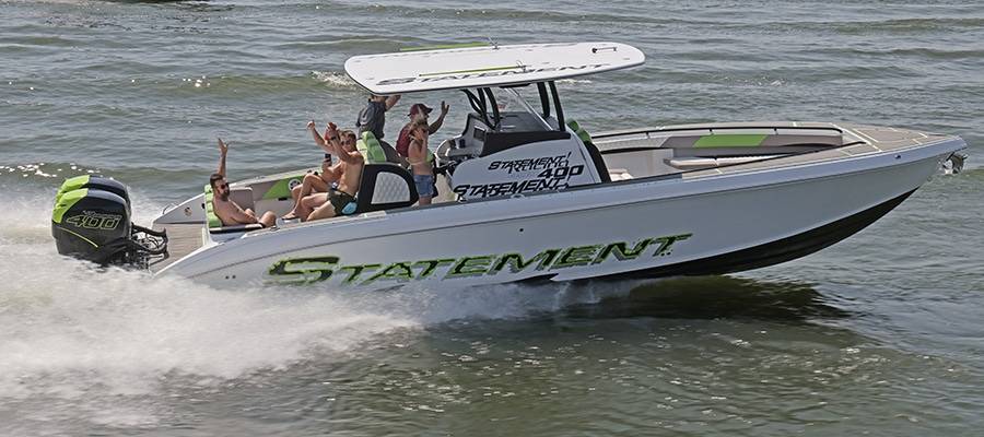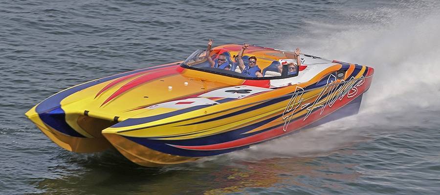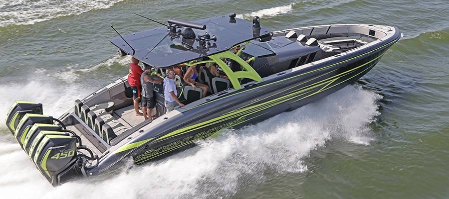 Heavy hardware attracts more heavy hardware such as LATE FEE$ X2, Mike and Angela Goldbaugh’s striking Skater Powerboats 368 catamaran.