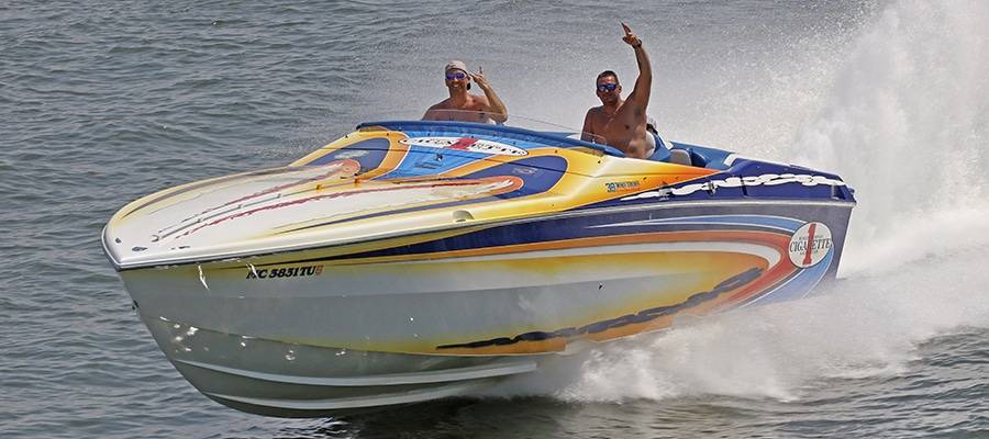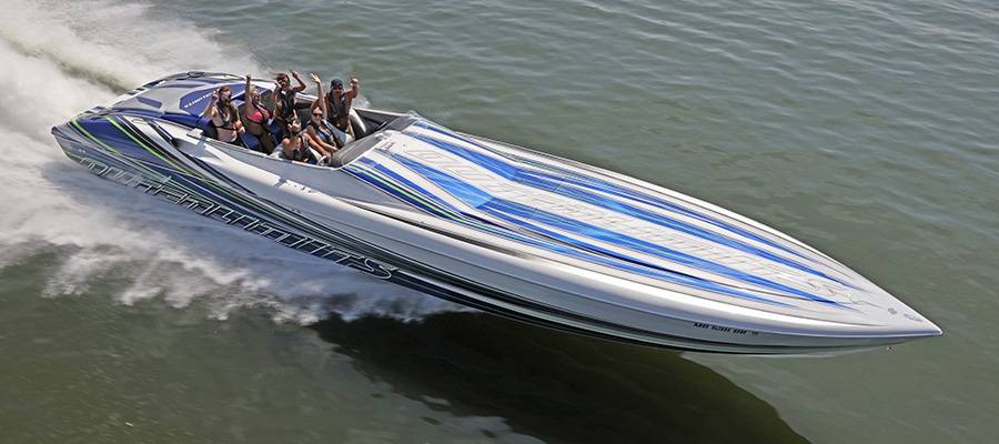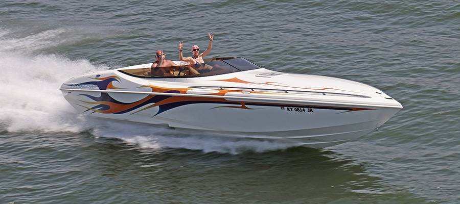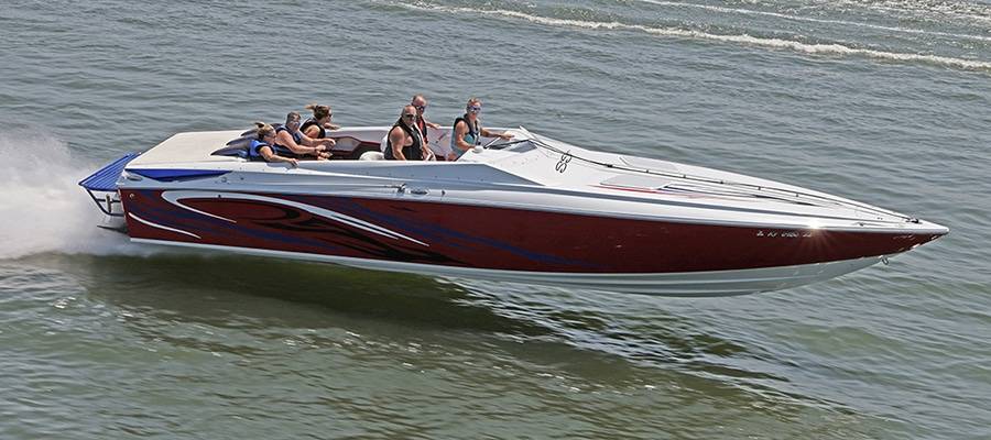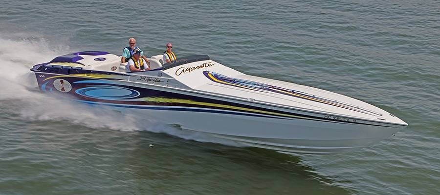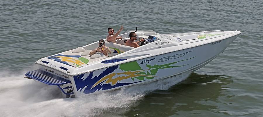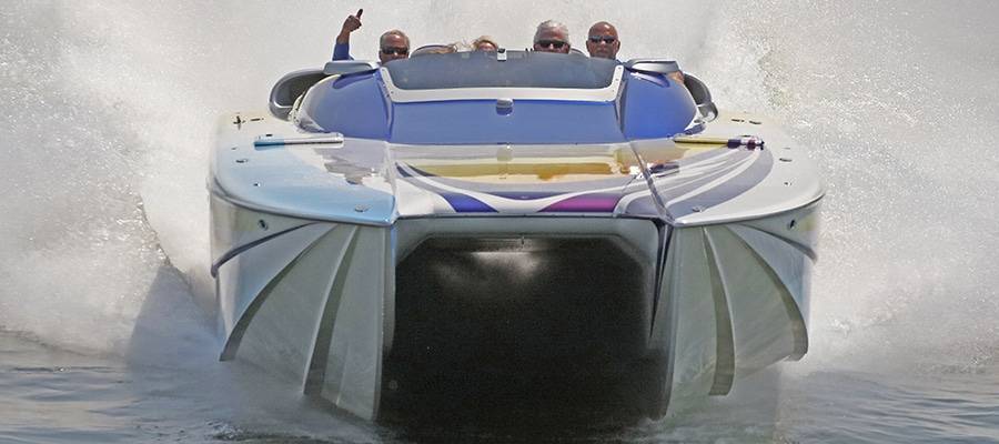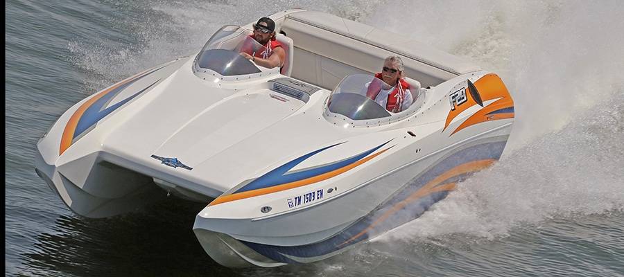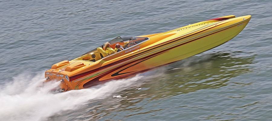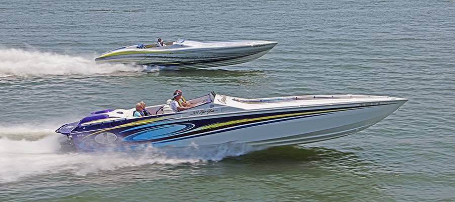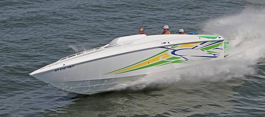 A high-performance powerboat graphics designer and painter of note, Miles is quick to deflect praise. But without clients such as his friend, Burton Kirsten, who ran his Stephen Miles Design-painted Outerlimits Offshore Powerboats SC 46 catamaran called Jet in last year’s event but couldn’t make it this time around, the Kuttawa Cannonball Run would not have reached its status as a top-flight event. Heavy hardware attracts more heavy hardware, and this year’s run saw the likes of Louisiana’s Nate Michel and Kentucky’s Dylan Thompson run the Cloud IX 40-foot MTI catamaran Michel sold Thompson in January, Alabama performance boaters Mike and Angela Goldbaugh’s Skater Powerboats 368 catamaran dubbed LATE FEE$ X2 and Holy Cow, a 36-foot MTI catamaran owned by Kelly and Julie O’Hara of Upstate New York.