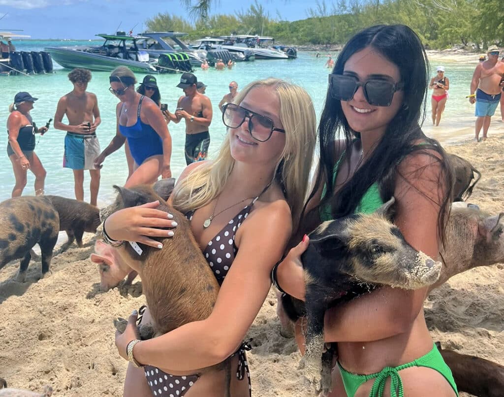 The locals of Pig Beach thrive as much on attention—and they get plenty of it from visitors to Meek’s Patch—as they do being hand-fed. Photos by Jackie Jones courtesy/copyright of the Florida Powerboat Club.