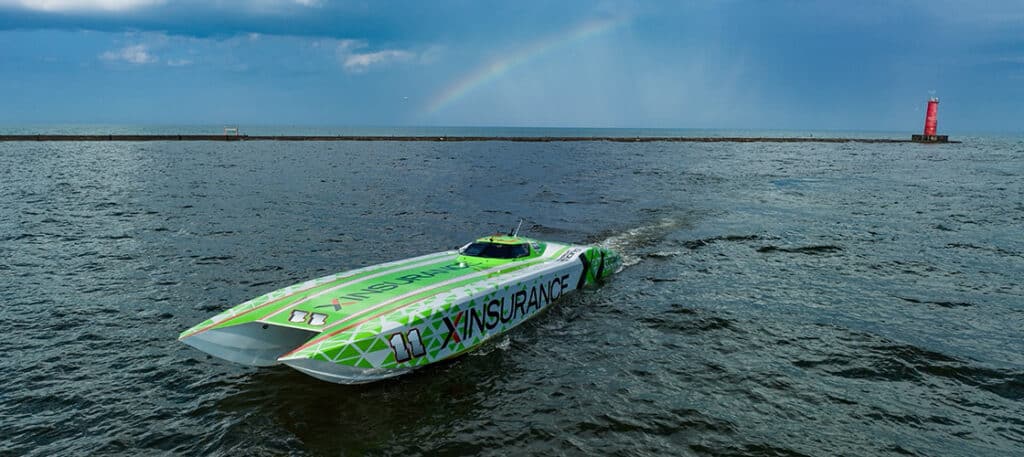 Maryland’s Brit Lilly will throttle the rebuilt XINSURANCE Class 1 raceboat alongside driver Randy Kent for the 2024 season. The team is owned by the Utah-based insurance giant’s Rick J. Lindsey.