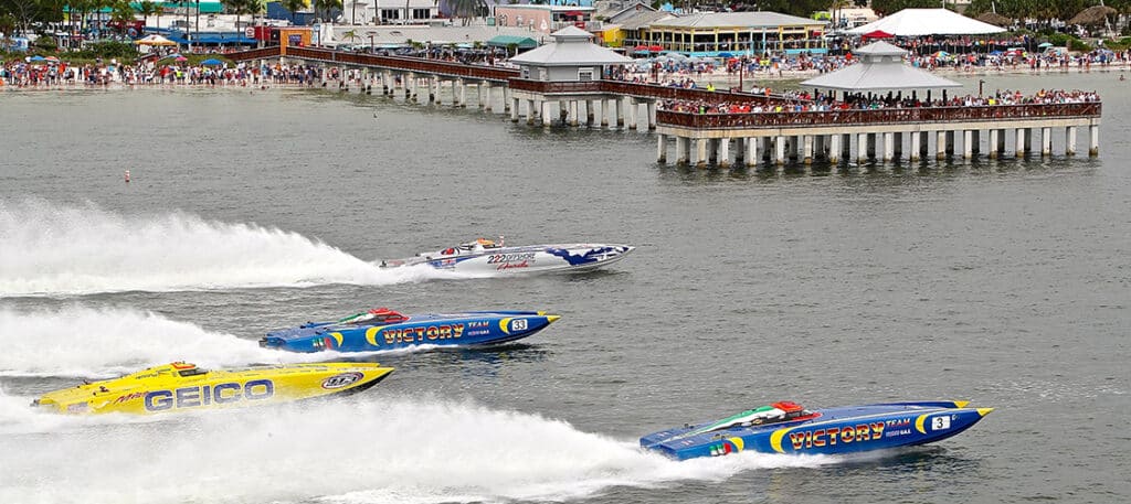 Though the Fort Myers Beach pier was destroyed in 2022 by Hurricane Ian, offshore powerboat racing will return to the Southwest Florida venue in 2024. Photo by Pete Boden copyright Shoot 2 Thrill Pix.