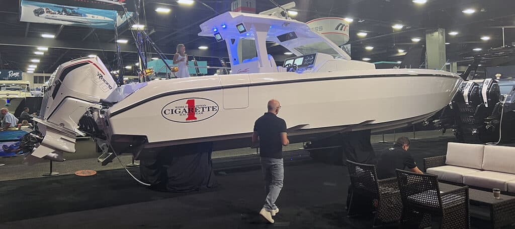 A 42X sportboat and a 41 Nighthawk center console rounded out the Cigarette display.