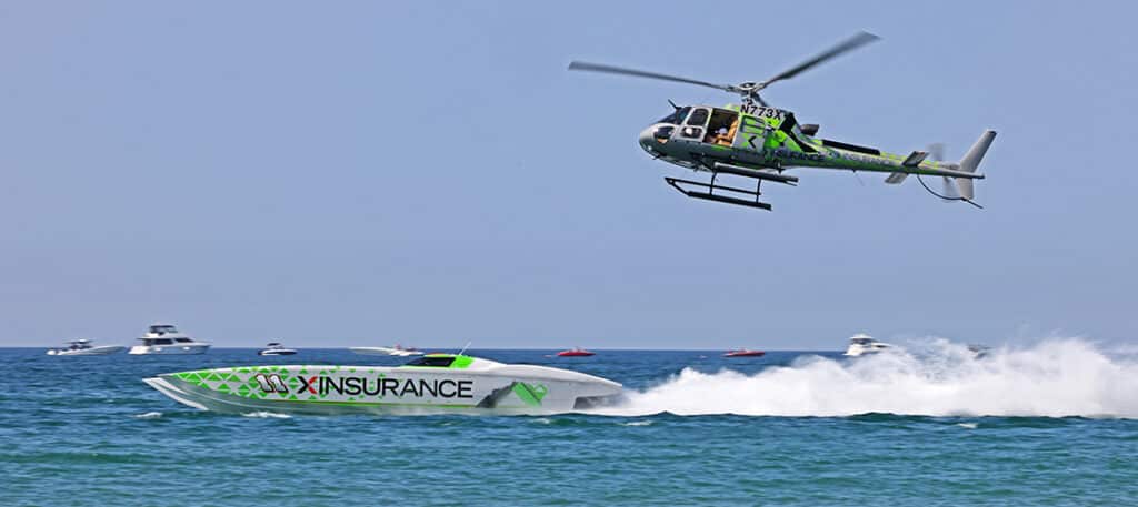 Piloted by Lindsey, the XINSURANCE “Heli-Cam” A-Star helicopter carrying his videographer son, Parker, is providing spectacular live aerial footage for both days of racing this weekend.