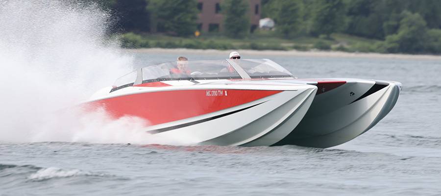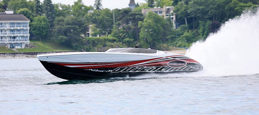 What makes this event so spectacular is contrast. Boyne City is a tiny waterfront town surrounded by wooded hills, a postcard of Americana in an unspoiled part of the natural world. So when an outrageous boat such as Hurry Up, a canopied 46-foot Outerlimits Offshore Powerboats catamaran recently repowered with 2,000-plus-hp engines, rolls through town on its way to the Lake Charlevoix, it turns heads.