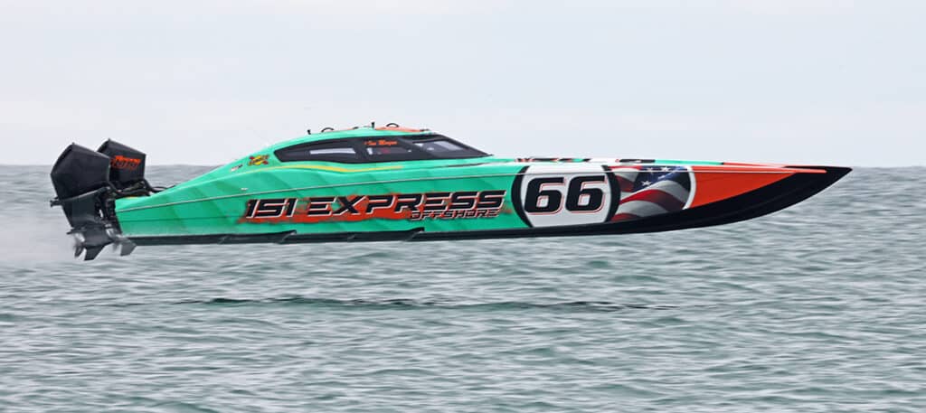 At the start of Sunday’s race, Reese Langheim had his usual throttleman, Julian Maldonado, back in the boat and they roared to the lead in Jackhammer. Montlick Injury Attorneys looked to be back to its usual form, challenging for the lead. Owner/driver Chad Rudesil and throttleman Rusty Williams ran third in the 39-foot MTI, Say Less MF, and 151 Express ran fourth.