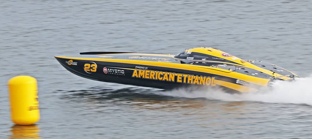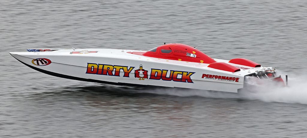 The closest challenger—at the moment—to American Ethanol was Dirty Duck, the remarkable Skater Powerboats 438 catamaran owned by Slug Hefner, driven by Myrick Coil and throttled by Rusty Williams that reached an impressive 199 mph in its only pass of the day after the thunderstorms blew through.