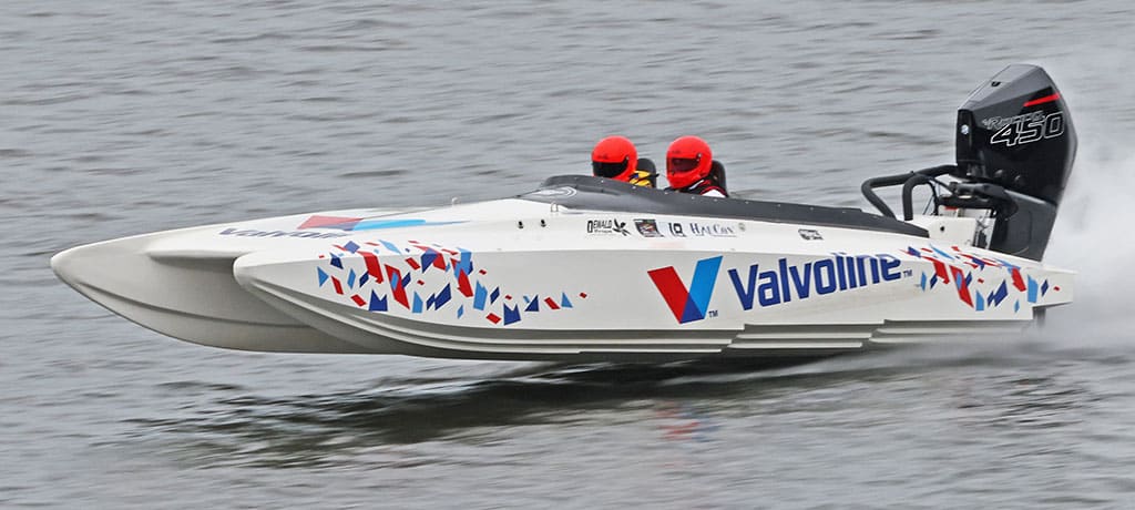 Somewhat unlikely participants, the Valvoline Powerboat Racing Norway team didn’t ship its boat all the way across the Atlantic Ocean to go home disappointed. In fact, the team had a great day at the Shootout to follow up an exciting week that included putting its Twister 24 catamaran powered by a Mercury Racing 450R engine on display at the Shootout On The Strip on Wednesday evening.