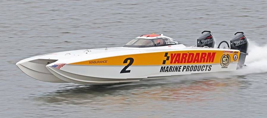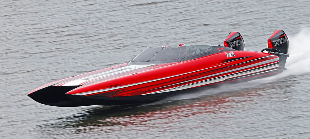 Other top outboard-powered catamaran speeds on Saturday included a 128-mph pass in a brand new DCB Performance M37R Widebody catamaran with twin 500Rs that is owned by Joe Juliano and was driven by DCB’s Tony Chiaramonte, a 124-mph pass in the twin 500R-powered Yardarm Marine Products-sponsored 36-foot Skater owned and raced by 77-year-old George Stancombe and his son, Micheal Stancombe, and a 112-mph pass by CR Racing teammates Casey Boaz and Rob Unnerstall in a 31-foot Victory Super Stock-class raceboat that Unnerstall said is for sale.