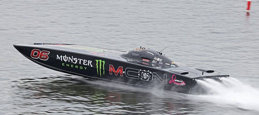 “The boat is an animal—it felt so good out there,” said Coil, the veteran offshore racer who is the shop foreman at Performance Boat Center, the title sponsor of the Shootout along with Monster Energy. “We’ll gather up tonight and see what we want to do. We have plenty more rpm and Carson (Brummett, the engine builder) said we have a little more boost, too, if we want it.”