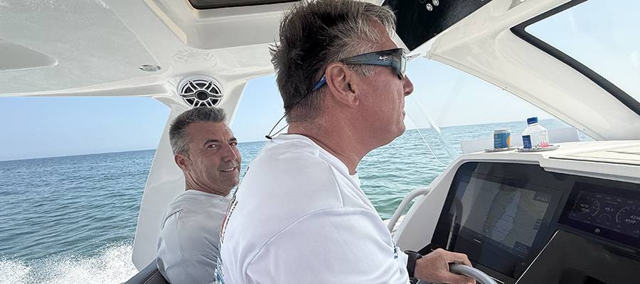 “This boat makes sense here on Long Island—it’s the perfect size and it do everything,” Fischer explained during a lunch run to Oakland’s Restaurant in Hampton Bays with his wife, Esposito, Valardi and his wife, Michelle, last Tuesday. “You don’t need a lot of people to handle it. It gets in and out of anywhere easily.