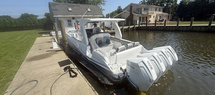 The couple’s expansive home backs up to the end of a canal, where they have a 2024 Deep Impact 369 center console on a temporary inflatable lift. Powered by four Mercury Racing 300R outboard engines, the 36-footer is the Fischer’s summer-boat.
