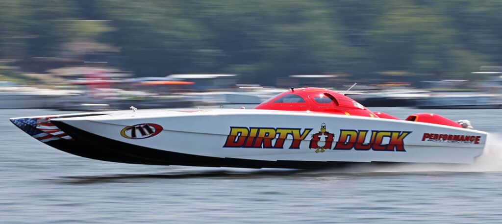 Myrick Coil and Rusty Williams ran an impressive 202 mph in Slug Hefner’s 43-foot Skater, Dirty Duck, on Sunday during the Lake of the Ozarks Shootout. Photos by Pete Boden/Shoot 2 Thril Pix