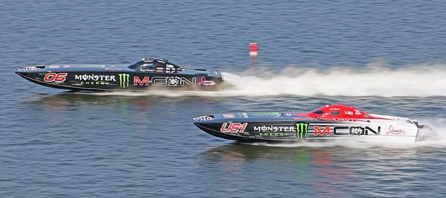 Why? Because spectators on Sunday witnessed the first 200-mph boat in event history that was not built by John Cosker and the team at Mystic Powerboats in DeLand, Fla. That’s right, a Skater Powerboats 438 catamaran owned by Slug Hefner that was driven by Myrick Coil and throttled by Rusty Williams—both of Performance Boat Center, the title sponsor of the Shootout with Monster Energy—reached a remarkable 202 mph on the Shootout course on Sunday just before noon.
