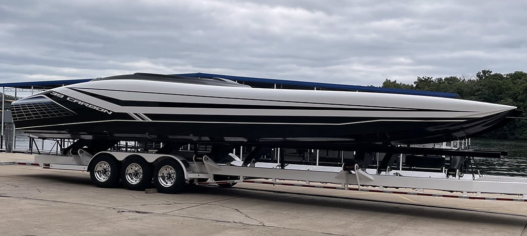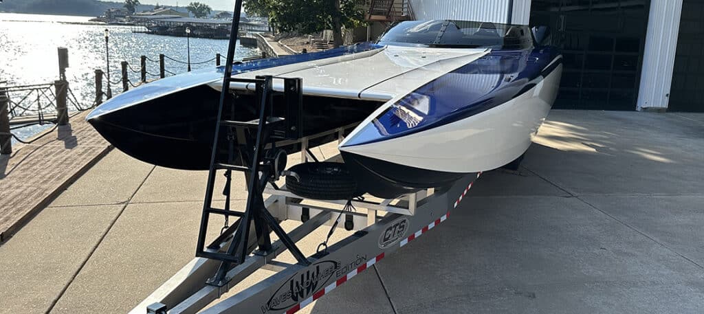 The first Doug Wright 39 Carbon Waves and Wheels Edition catamaran is ready for its Lake of the Ozarks Shootout close-up next week. Photos courtesy Justin Wagner
