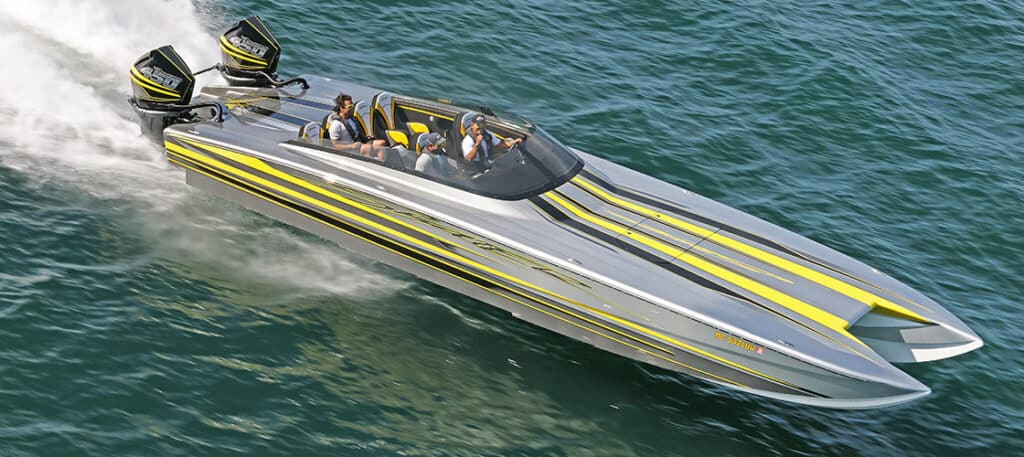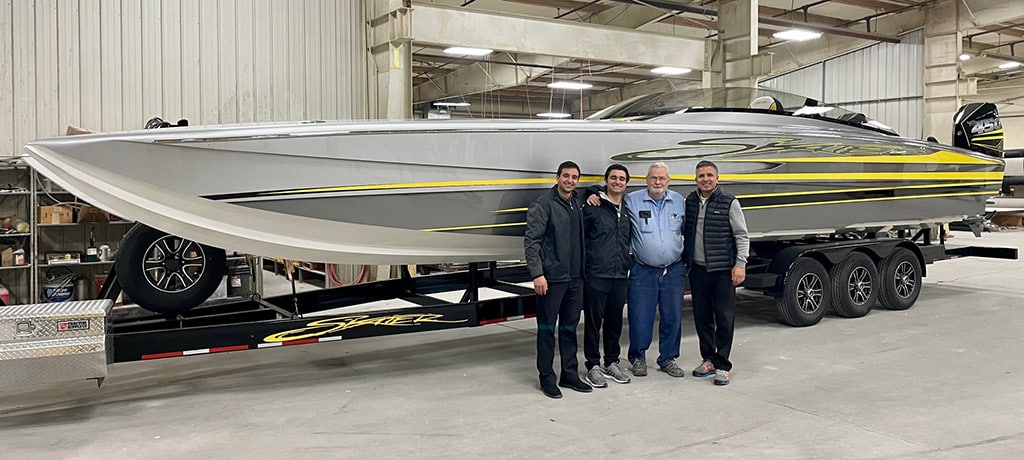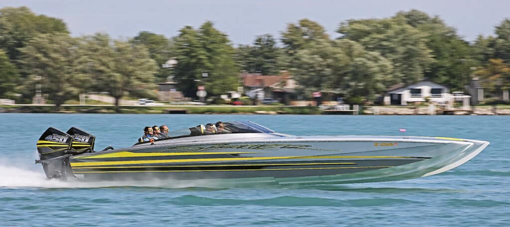 That was especially the case upon meeting the Monsour family during the 20th anniversary of the Boyne Thunder Poker Run in Northern Michigan a few months ago. When Tony Cutsuries, the national sales manager for Skater Powerboats in Douglas, Mich., introduced me to Chris Monsour, a commercial real estate executive from Southeast Michigan, I could tell by his energetic handshake and radiant smile that he was excited to own his first Skater catamaran, a 368 powered by twin Mercury Racing 450R engines painted to match the boat’s striking gray, yellow, and black graphics designed and applied by Steve and Jake Schulte, Skater’s talented father-son paint team.