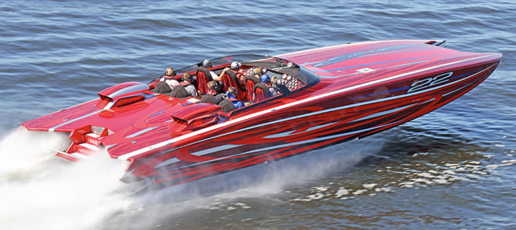 The event’s permanent move to fall will enable Jorge Arellano—above with friends in his DCB Performance Boats M35 Widebody catamaran—to make it to the Lake of the Ozarks Shootout for the first time next year.