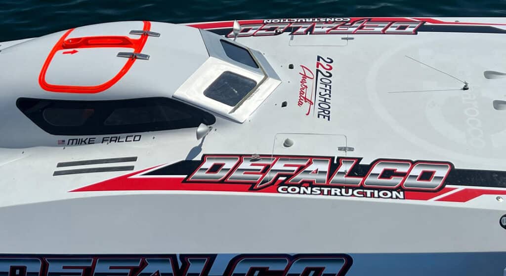 Unfortunately, the cat didn’t arrive until mid-Thursday morning and wasn’t ready for water-testing—prep includes re-mounting the outboards engines which are removed for shipping, and inspections—until that evening. During the following morning’s test-session, Giovanni Carpitella, the Australia-based team’s regular throttleman, shared the cockpit with Falco.