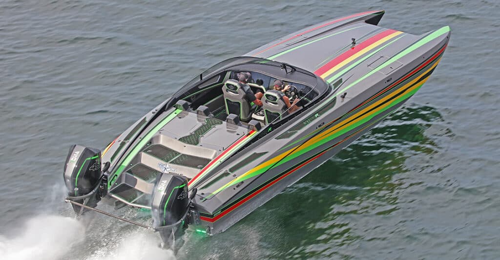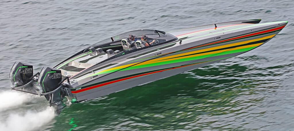 Offered through Phoenix-headquartered DCB Performance Marine, this colorful M37R Widebody catamaran is powered by twin Mercury Racing 450R outboard engines mounted on billet STR brackets. According to the listing, the carbon fiber and Kevlar 37-footer’s engines have 135 operating hours. Anodized aluminum cleats, a retractable boarding ladder and underwater lighting are the among the items on the cat’s extensive exterior hardware list.