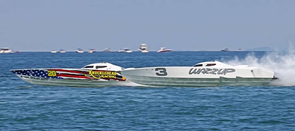 Arguably the crowd favorites were the nearly identical 40-foot Fountains, Wazzup, with Anthony Smith throttling and Ed “Smitty” Smith driving and Knucklehead with owner/driver “Evil” Ed Smith and throttleman Johnny Stanch. Knucklehead won in Atlantic City while Wazzup took the win in St. Clair, Mich., so Michigan City was the rubber match.