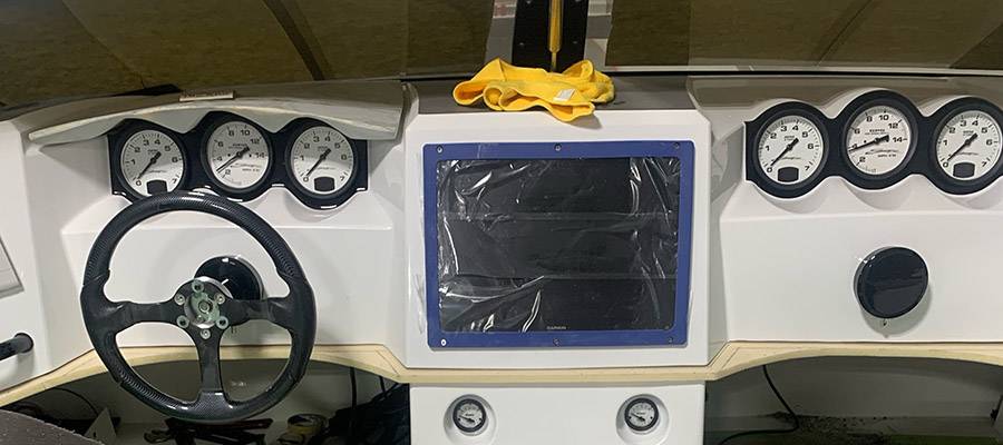 While “build one” typically means “ordered one” in the go-fast boating world—even in the custom realm—the expression is more literal for Bareman. He rigged the boat from stem to stern. He installed and wired its entire electronics system, which includes C-Zone switching, one 17-inch Garmin GPS and two nine-inch Garmin GPS units, a Mercury Marine VesselView monitor, a trio of gauges on each side of the dash and LED lighting with Shadow Caster control. (He actually “fired up” the cat’s electrical system for the first time today and everything is working.)