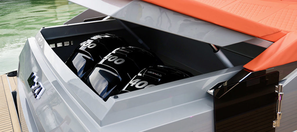 For the record, until today I had no idea that De Antonio Yachts existed, much less that the brand is manufactured in Barcelona, Spain. I don’t cover the yacht segment so I easily can forgive my ignorance. But with triple Mercury Marine Verado 400 outboard engines under the hatch, the 42-footer at the Sea Isle Marina and Yachting Center docks definitely caught my attention. Plus, the boat was super stylish.