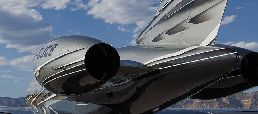 Then again, this Bombardier Global 5500 aircraft boasting graphics designed by Stephen Miles of Stephen Miles Design flies faster with a top speed of 690 miles per hour—that’s Mach .90 for the record—and farther with a range of 6,789 miles than any go-fast catamaran or V-bottom on the planet. And it boasts a color scheme created by one of the most talented gentlemen in the high-performance marine industry.
