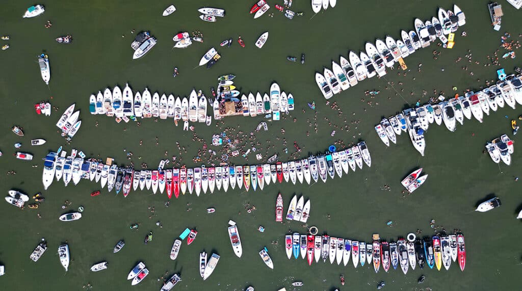 • Brett Manire, the co-owner Sunsation dealer Performance Boat Center in Osage Beach, Mo., has been selling powerboats for most of his adult life. The guy has experienced plenty of raft-offs. His description? “Mind-blowing turnout, three feet of water, hundreds of boats, a total s-show.”