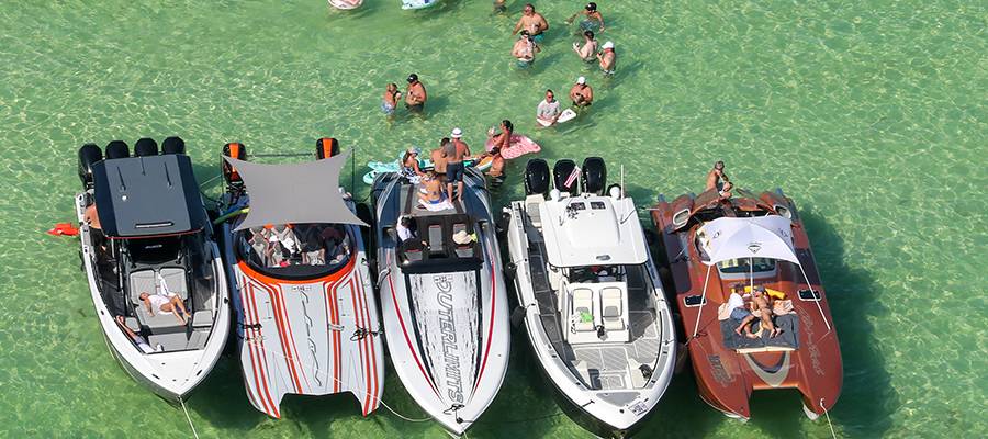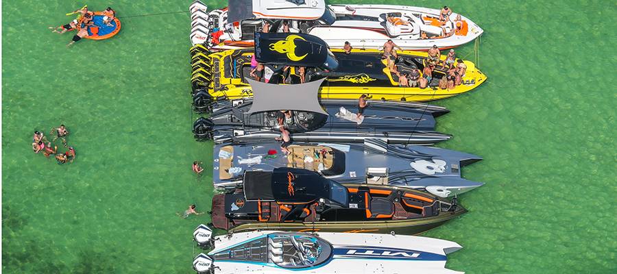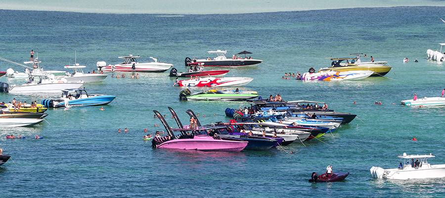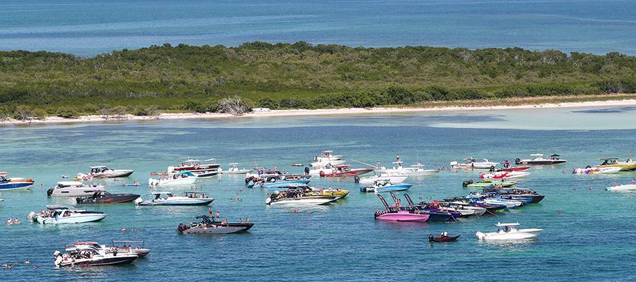 The largest concentration of boats made its way to Woman Key for an afternoon raft-up. Helmkamp was in the air via helicopter to captured it all, as well as boats arriving and departing the good-time scene.