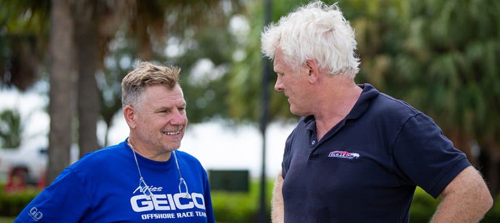 Captured here with multi-time Class 1 world champion Steve Curtis (right), Gary Stray brings a wealth of information to the Doug Wright Racing division. Photo by Cole McGowan copyright Powerboat P1.