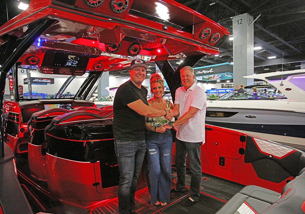 Pictured with MTI founder Randy Scism, Tyler and Lindsey Miller were stoked to see their new MTI-V 50 center console in person at the Miami Beach Convention Center.