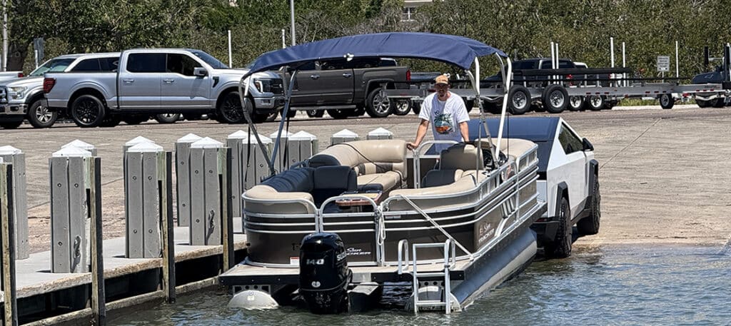 As we waited for our mutual friend, Ron Muller, to back the cat’s trailer into the water, a Tesla Cyber Truck pulling a Tracker pontoon boat backed down the ramp to launch.