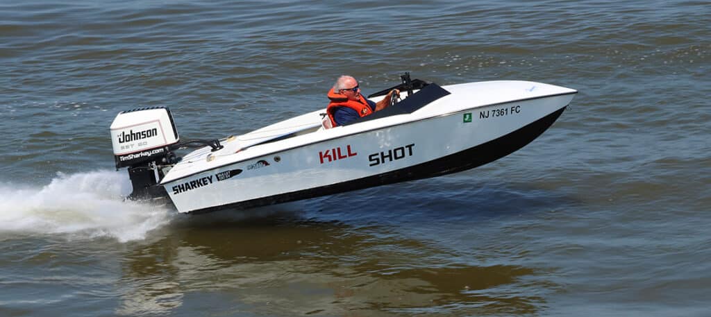Tim Sharkey of Sharkey Images had a blast running his restored Bullet 130 sportboat in the Tiki Lee’s Shootout On The River poker run. Photo by Randy Nuzzo/Powerboat Photos