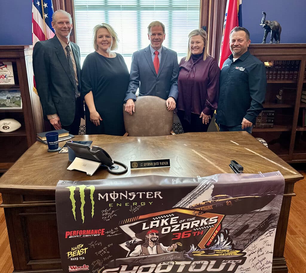 Lake of the Ozarks Shootout executive director Leah Martin, longtime board of directors president Mark Maasen and Bob Morgan Memorial Lake of the Ozarks Shootout Hall of Famer Myrick Coil of Performance Boat Center, the event’s presenting sponsor, met with Lieutenant Governor Wasinger earlier this week to finalize the agreement.