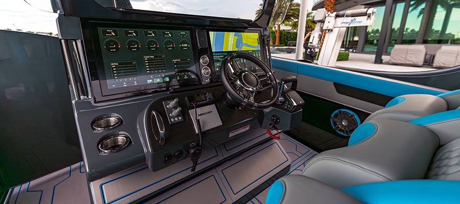Levinson went bigger in more than a few ways with his latest build from the DeLand, Fla., company. First, the boat is an M4200 powered by quad Mercury Racing 450R outboard engines. His first two Mystic center consoles were M3800s, the first with quad 300R outboards and the second with quad 450Rs.
