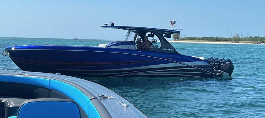 Among the Mystic owners who made the trip were Joshua and Johanna Denning of Iowa. First-timers to The Bahamas, the Dennings own a 2019 model-year M4200 center console powered by Mercury Racing 400R engines of the original six-cylinder kind and, including their children, had six guests for the adventure.