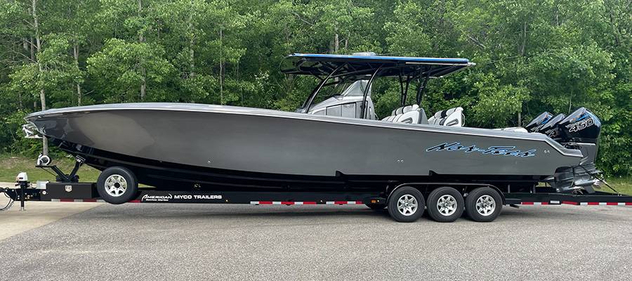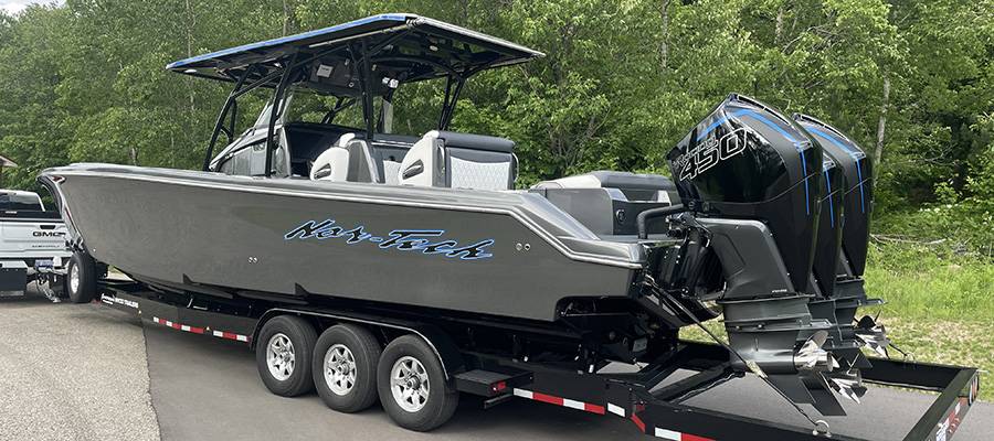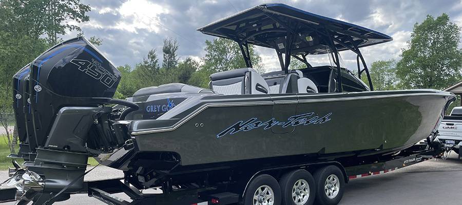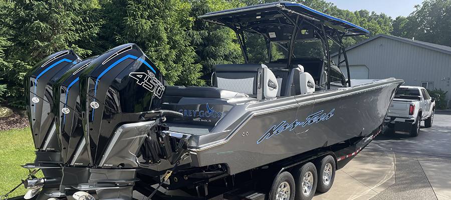 The Harmons purchased the Titan-grey-and-black 39-footer through Great Lakes Nor-Tech dealer American Custom Marine of Kimball, Mich. Michael Knoblock, the owner of the multi-brand dealership, delivered the boat to the couple in Michigan earlier this month.