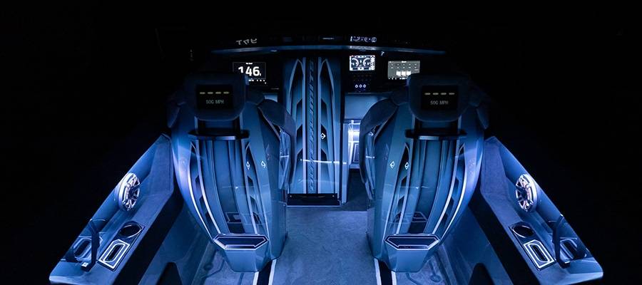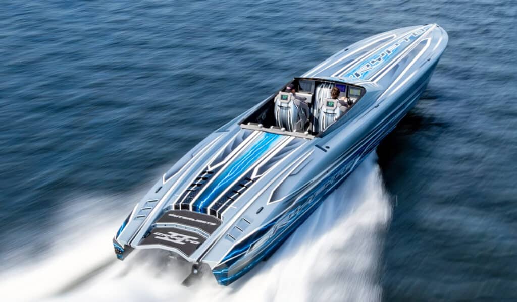 As are all V-bottoms and catamarans from in Bristol, R.I., custom V-bottom and catamaran company, the 50-footer is a post-cured carbon-fiber-and-epoxy build. Kentucky-based Stephen Miles Design painted the boat and Kutting Edge Interiors of Missouri handled what Outerlimits general manager Dan Kleitz described as a “one-of-a-kind” interior.