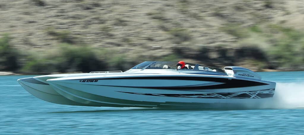 In other noteworthy catamaran performances, Steven Sundling ran 171.5 mph in a DCB Performance Marine M31 Widebody catamaran dubbed Captain Hook, fellow M31 owner Jeff Clark ran 164.8 mph in Liquidated Damages and Nick Child piloted Wild Child, his DCB M37R catamaran, to 141.9 mph.
