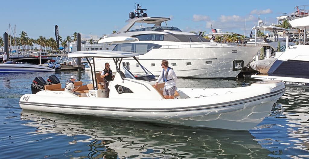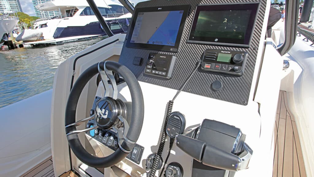 And the 12-foot wide RIB had no trouble executing them. It didn’t slide or bobble. It carved. As we expected with 1,000 hp worth of outboard engines providing the punch, the boat accelerated hard.
