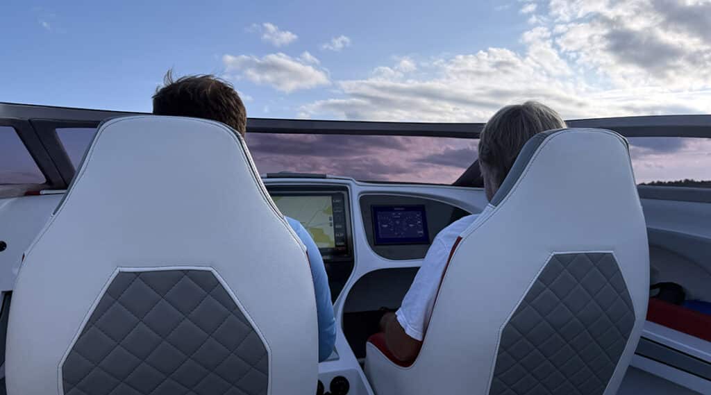 Viewed from the docks, the 32 looks smaller than the 34 because—go figure—it is. I didn’t measure it, but I it also appears slightly lower to the water. Both cockpits have generous space between the four-seat rear bench and the bucket seats for the driver and co-pilot.