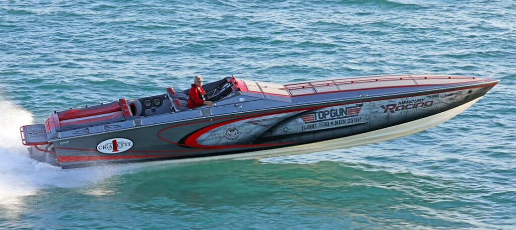 At a glance from a distance, the Jones family’s 11,000-pound Cigarette looks much the same as it did when it first hit the water as Project 1080. Move a little closer, however, and you’ll notice that the graphics have changed. The Project 1080 handle has been replaced with Top Gun Flight 1130 and there’s a new and instantly familiar graphic element on its hullsides.