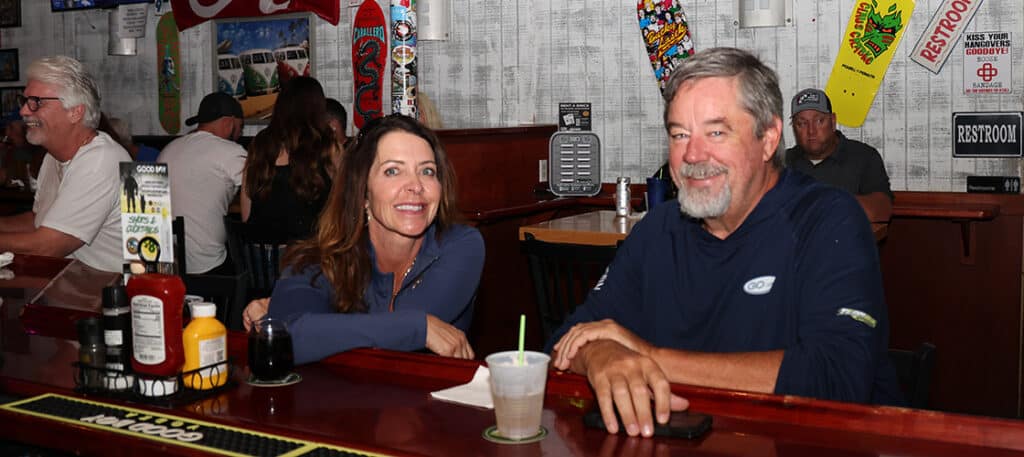 Simon Williams of party backer GoGPS and Dee Babcock enjoyed a quiet moment in the Pickle’s Pub Sandbar before the party go rolling.