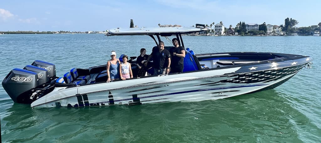 Failla settled on a Statement 350 center console powered by triple Mercury Racing V-10 400R outboard engines. But Buis, who wanted to honor the service of his friend, had a few ideas of his own for the 35-footer’s graphics. So he reached out to Tamara Failla.